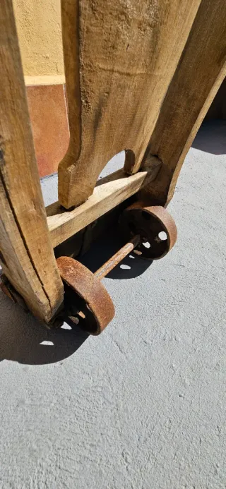 Pieza antigua de madera con detalles metálicos. - Estructura de madera. - Base metálica oxidada.