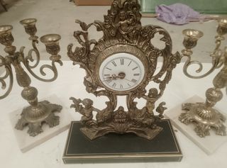 Juego de reloj y candelabros de metal en perfecto estado.