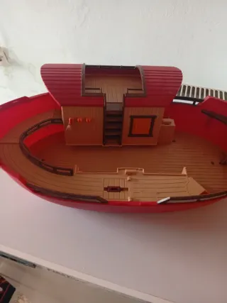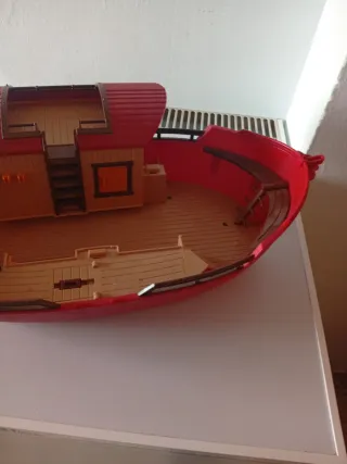 Barco de juguete de Playmobil con detalles de madera y techo rojo. - Casco exterior de color rojo. - Cubierta de madera. - Estructura de cabina con techo a dos aguas.