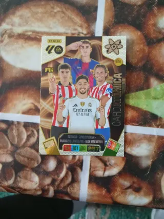 Carta coleccionable de fútbol Card Atómica de Panini. - Número de carta: 476. - Jugadores: Fermín, Saviñol, Marcos Llorente, Fede Valverde. - Incluye estadísticas de juego.
