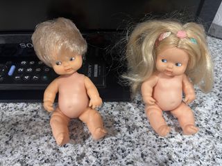 Lote de dos muñecas Barriguitas. - Muñeca con pelo rubio y flequillo. - Muñeca con pelo rubio recogido en coletas.