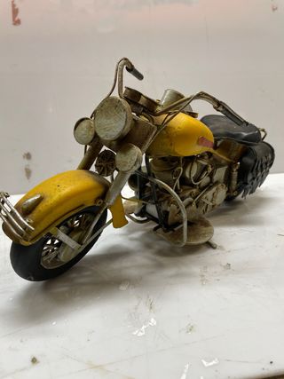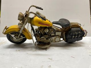 Detallada moto decorativa fabricada en metal con un acabado envejecido y color amarillo. - Diseño clásico de motocicleta. - Detalles en el motor y accesorios. - Ideal para coleccionistas o decoración.