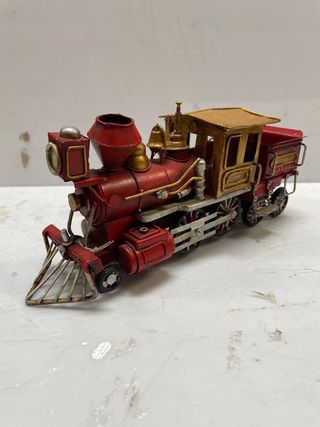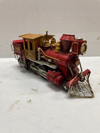 Locomotora decorativa de metal, ideal para añadir un toque vintage a tu hogar o espacio. - Diseño detallado de locomotora. - Material: Metal. - Color: Rojo con detalles dorados.