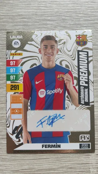 Carta de colección Autógrafo Premium de Fermín de LaLiga. - Incluye autógrafo original. - Diseño con detalles dorados. - Serie: 291 - Cartas: 200