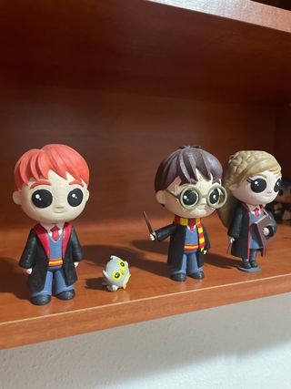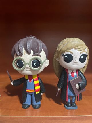 Colección de figuras de los personajes de Harry Potter. En 3d pintado a mano - Figuras de estilo chibi o funko pop. - Incluye a Harry Potter, Ron Weasley y Hermione Granger. - Pequeña figura de Hedwig (la lechuza). - Vienen con sus túnicas de Hogwarts y accesorios como varitas y libros.