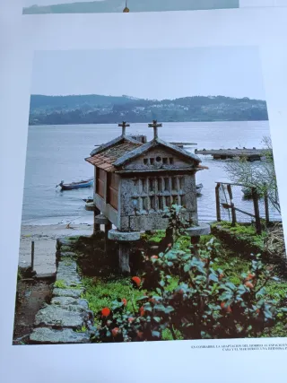 Conjunto de seis láminas fotográficas que capturan la esencia de los hórreos de Galicia. Cada lámina muestra la arquitectura tradicional gallega en su entorno. Editadas por el Banco Pastor. Vienen en su carpeta original - Representación de hórreos. - Fotografía de paisaje.