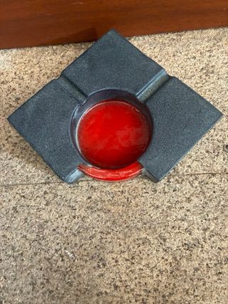 Elegante cenicero de cerámica con un diseño contemporáneo y un llamativo detalle en color rojo. - Material: Cerámica. - Color principal: Gris oscuro con acabado texturizado. - Detalle: Círculo central y arco en color rojo brillante.