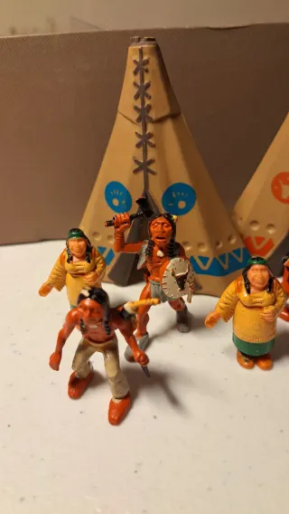 Conjunto de figuras e acessórios da linha Exin West. - Figuras de índios e acessórios. - Inclui cenários de 2 tipis - 5 indios y 2 indias
