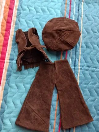 Conjunto de ropa de gamuza para muñeca. - Chaleco con flecos. - Pantalones acampanados. - Gorro. - Material: Gamuza.