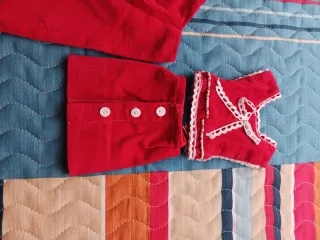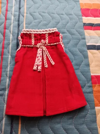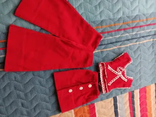 Conjunto de ropa para muñeca Nancy. - Incluye falda y chaleco. - Color rojo. - Detalles de encaje blanco y lazo en el chaleco. - Botones blancos en la falda.mas pantalón.