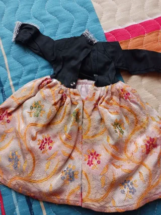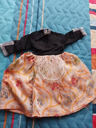 Vestido tradicional de fallera para muñeca Nancy. Un diseño elegante y detallado. - Cuerpo negro con detalles en cuello y puños. - Falda con estampado floral y motivos dorados. - Adorno de encaje en la parte delantera de la falda.