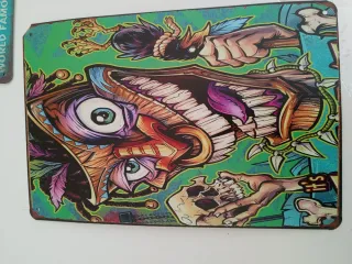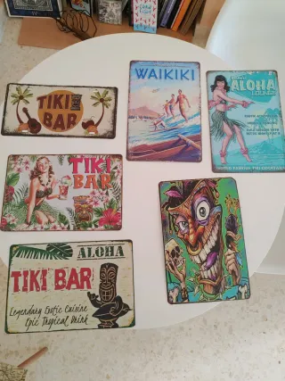 Lote 6 Conjunto de carteles de hojalata con temática hawaiana y estilo tiki lote completo 12 euros, Perfectos para decorar tu bar o espacio. - Diseño Tiki Bar con guitarra y palmeras. - Diseño Waikiki con surfistas. - Diseño Aloha Lounge con pin-up. - Diseño Aloha Tiki Bar con texto y figura tiki. - Diseño colorido con figura tiki y calavera.