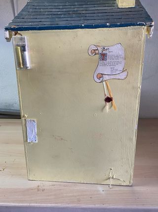 Casita de muñecas con encanto, lista para ser renovada y personalizada. - Fachada amarilla. - Tejado a dos aguas con tejas. - Balcón con barandilla. - Puerta de entrada amarilla. - Ventanas tipo mirador.