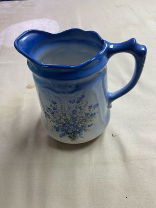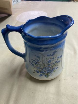 Jarra de cerámica con un bonito diseño floral en tonos azules y blancos. El borde superior tiene una forma ondulada y el asa es curva. - Color: Azul y blanco - Diseño: Flores azules - Material: Cerámica