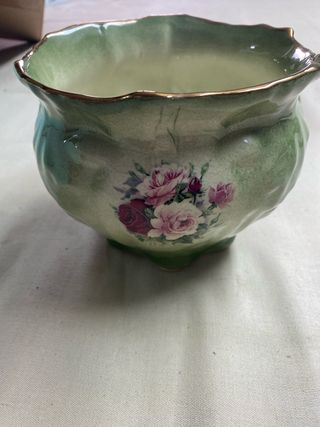 Bonito macetero de cerámica con un diseño floral. - Color verde degradado. - Detalle de rosas pintadas. - Borde superior con acabado dorado. - Forma ondulada.