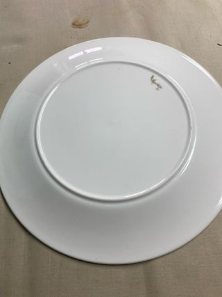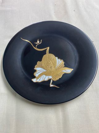 Elegante plato decorativo con un diseño de flor en tonos dorados y blancos sobre fondo negro. - Diseño de flor estilizada. - Acabado en dorado y blanco. - Base de color negro.