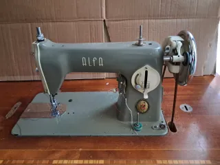 Máquina de coser Alfa. En funcionamiento. 2 cajones en la tabla.