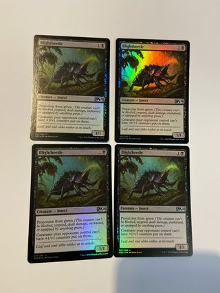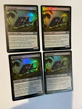Conjunto de 4 cartas de Blightbeetle en perfecto estado (NM) y foil. Edición en inglés. - Tipo de criatura: Insecto. - Coste de maná: 1B. - Poder/Resistencia: 1/1. - Habilidad: Protección contra verde. Las criaturas de tus oponentes no pueden tener contadores +1/+1.