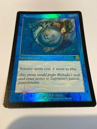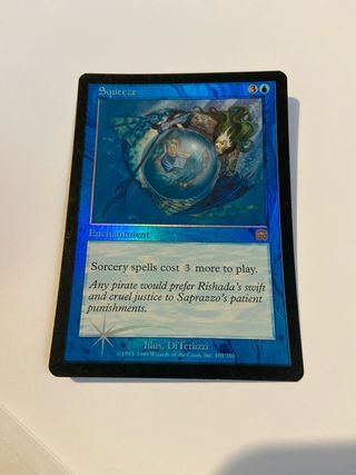 Carta de Magic: The Gathering, Squeeze, edición Mercadian Masques. - Carta foil (metalizada). - Tipo: Encantamiento. - Coste de maná: 3 genérico. - Efecto: Los hechizos de conjuro cuestan 3 más para ser jugados. - Ilustración de DiTerlizzi. - Publicada entre 1993-1999.