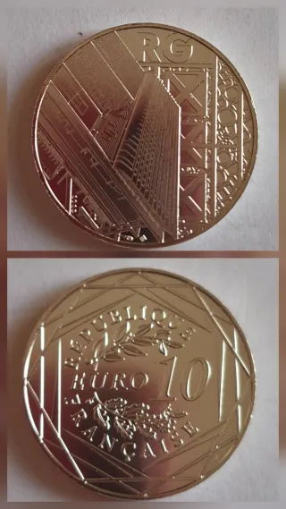 Moneda conmemorativa de Francia de 10 euros del año 2025, dedicada a Roland Garros. Diseño con edificios emblemáticos y detalles arquitectónicos. - Valor nominal: 10 Euros - Año: 2025 - País: Francia - Tema: Roland Garros