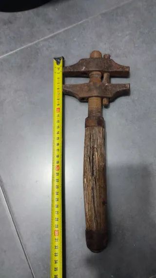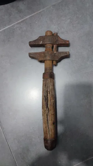 Herramienta manual antigua, tipo llave inglesa. Esta como se ve en las fotos - Cuerpo metálico con acabado oxidado. - Mango de madera desgastado. - Mecanismo de ajuste visible.