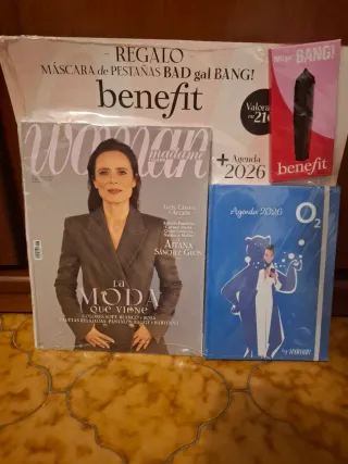 Lote de revista Woman Madame con portada de Aitana Sánchez-Gijón. Incluye regalo de máscara de pestañas Benefit BAD gal BANG! y agenda 2026. - Revista Woman Madame. - Máscara de pestañas Benefit. - Agenda 2026.