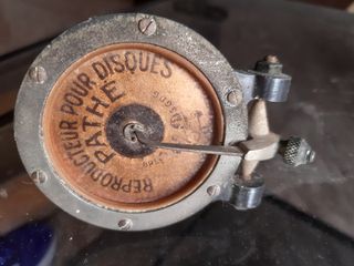 Diafragma de repuesto para gramolas Pathé. - Pieza circular con inscripciones. - Incluye soporte y aguja.