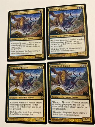 Conjunto de cuatro cartas Nemesis of Reason del juego de cartas coleccionables Magic: The Gathering. - Cada carta es Nemesis of Reason. - Tipo de criatura: Leviathan Horror. - Coste de maná: 3UU. - Poder/Resistencia: 3/7.