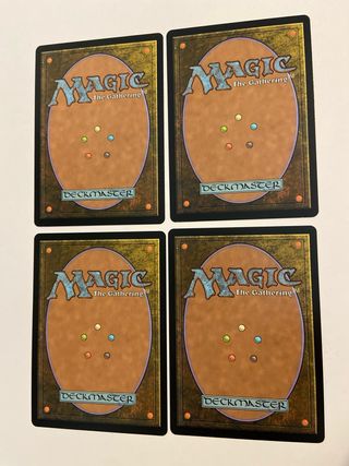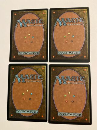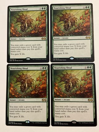 Conjunto de 4 cartas de Magic: The Gathering, Nourishing Shoal. - Cartas de la expansión UMA. - Cada carta es de rareza R (Rara). - Ilustración de Greg Staples.