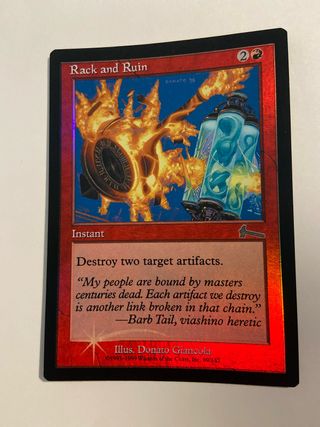 Carta de Magic: The Gathering, Rack and Ruin, en su versión foil. - Tipo: Instantáneo - Coste de maná: 2R - Efecto: Destruye dos artefactos objetivo. - Ilustración: Donato Giancola - Edición: 89/143