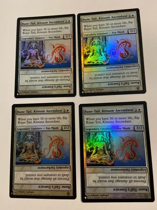 Conjunto de 4 cartas Rune-Tail, Kitsune Ascendant de Magic: The Gathering. Son cartas foil. - Cada carta tiene un coste de maná de 2W. - Son criaturas legendarias tipo Fox Monk con estadísticas de 2/2. - Habilidad: Cuando tengas 30 o más vidas, voltea Rune-Tail, Kitsune Ascendant. - Habilidad: Evita todo el daño que se les infligiría a las criaturas que controlas.