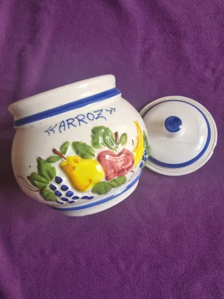 Tarro de cerámica vintage pintado a mano con tapa, decorado con frutas y la palabra Arroz. - Ideal para almacenar arroz o como pieza decorativa. - Cerámica blanca con detalles en azul. - Decoración de frutas coloridas en relieve (manzana, pera, plátano, uvas). - Tapa a juego con un pequeño pomo azul. Vez los desperfectos de la tapa en las fotos