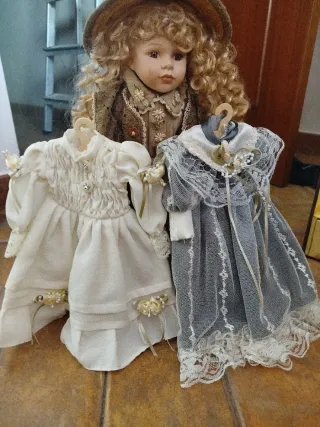 Muñeca vintage con vestido de época. - Cabello rubio largo. - Ojos azules. - Vestido con estampado floral y detalles de encaje. - Incluye un gorro a juego. - Ideal para coleccionistas