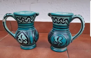 Lote 2 jarritas vintage de ceramica esmaltada de Paterna C. Santa Maria basada en el siglo XIII con motivo floral de color verde con pequeños desperfectos escochen en el pitorro que se pueden ver en las fotos Ideal para coleccionistas Alto 14cm Diametro base 7cm Ancho con asa 13cm Peso 375gr - Fabricadas por Paterno C. Santamaría.