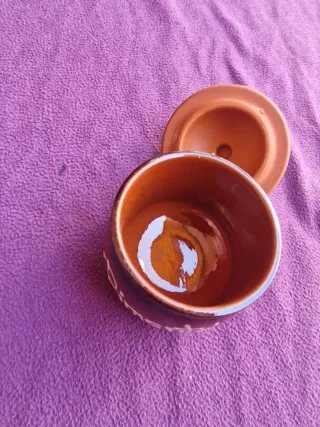 Recipiente vintage de cerámica, ideal para pimentón o como objeto decorativo. - Color marrón brillante. - Diseño rústico.