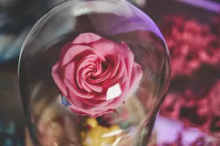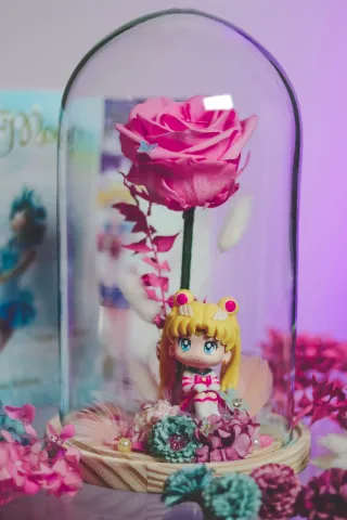 Preciosa cúpula decorativa con una rosa preservada y una figura de Sailor Moon. Ideal para coleccionistas o como regalo. Realizado artesanalmente.