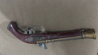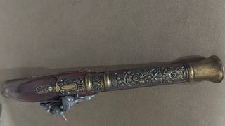 Réplica de pistola antigua con detalles ornamentales. - Cuerpo principal de madera oscura. - Detalles metálicos dorados y plateados con grabados.