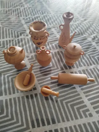 Conjunto de miniaturas de madera, perfectas para coleccionistas o decoración. - Incluye varios utensilios de cocina en miniatura como mortero y rodillo. - También se incluyen varias figuras de jarrones y recipientes. - Fabricadas en madera.
