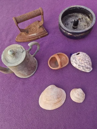 Conjunto de objetos decorativos vintage. - Plancha antigua de hierro oxidado. - Tetera metálica con asa. - Cazo pequeño de barro. - Concha de mar con patrón moteado. - Dos conchas de almeja y otros mas
