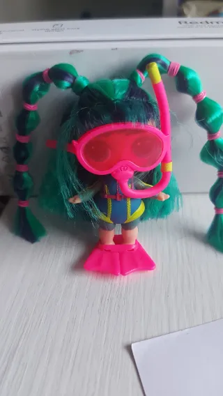 Muñeca LOL con un llamativo pelo verde y azul, recogido en dos coletas con gomas rosas. Lleva un traje de buceo azul y amarillo con detalles rosas y aletas. - Pelo largo y rizado. - Traje de buceo. - Aletas rosas.