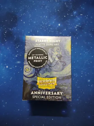 Fundas para cartas Dragon Shield con arte Starry Night de edición especial. - Diseño Matte Dual Art. - Arte con acabado Metallic Print. - Edición Anniversary Special Edition.