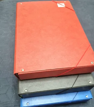 Lote de tres carpetas de tamaño A4. Dos de ellas son de color rojo y una gris. 3 euros las tres - Cierre con goma elástica. - Cuentan con un portacarnet.