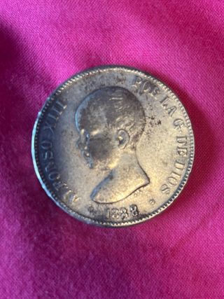 Moneda de plata de 5 pesetas de Alfonso XIII, acuñada en 1888. - Canto: PU.S. + ULTRA + PU.S. - Reverso: Escudo de España coronado. - Anverso: Retrato de Alfonso XIII.