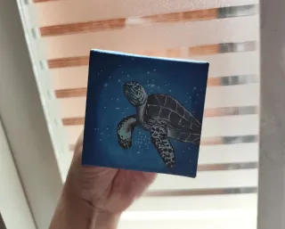 Pequeño lienzo decorativo con diseño de tortuga marina pintado a mano con acrílicos. - Medidas: 7x7 cm. - Técnica: Pintura acrílica. - Diseño: Tortuga marina. - Ideal para coleccionistas o como detalle decorativo. Sígueme en Instagram: Hanaoii.doodles