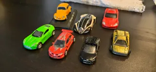 Conjunto de varios coches de diferentes colores y modelos. Se venden tal como se ven en las fotos, con algunos desperfectos. - Lamborghini Diablo de Majorette - Renault Megane de Norev - Volkswagen Escarabajo escala 1:43 - Concept car (Norev) escala 1:43 sin ruedas - Chevrolet Corvette C6 (Ixo) escala 1:43 sin ruedas - Audi R8 descapotable - Aston Martin (creo que el el One) No hay ninguno que esté perfecto. El Lamborghini está bastante mal de pintura, aunque sería una buena base para hacer un custom. Es completamente metálico. Al escarabajo le faltan cosas como faros y parachoques.