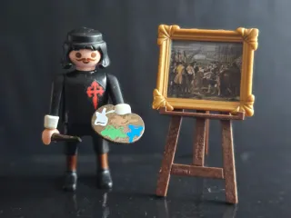 Figura de Playmobil del pintor Diego Velázquez con su obra La Rendicion de Breda. - Incluye paleta de pintor y pincel. - Detalle de la Cruz de Santiago en el pecho.