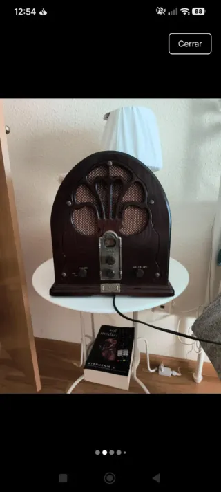 Radio Daklin modelo 1932 con un diseño clásico y elegante. - Acabado en madera oscura. - Altavoz con rejilla decorativa. - Controles de volumen, tono y sintonización. - Placa frontal con el nombre de la marca.