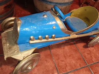 Este es un coche de pedales antiguo con un diseño clásico y llamativo. Su color azul vibrante y los detalles dorados le dan un toque retro.esta MAL PINTADO...pero en general bien...chapa y partes del chasis en madera.... juguete antiguo rico jyesa nacoral paya - Carrocería de color azul. - Detalles y llantas en color dorado. - Volante y asiento en tono dorado.