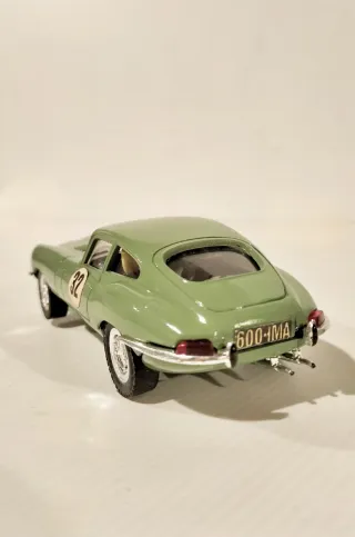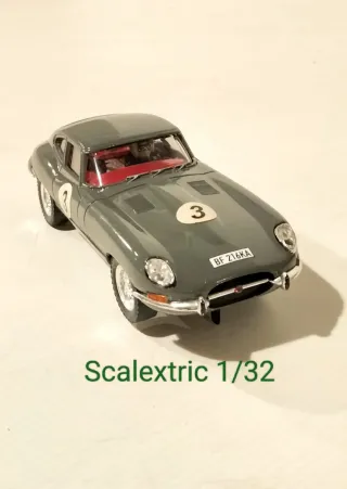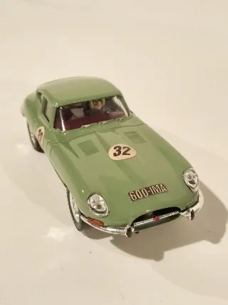 Recreación artesanal única de Jaguar E Type verde oliva con interior bandeja granate, con detalles pintados a mano, como, cuerpo piloto, guantes, volante, tiradores puertas, gomas parachoques, limpiaparabrisas, intermitentes delanteros naranja, logo parachoques delantero, cristal delantero sin las letras blancas de Scalextric, matrículas y dorsales con efecto envejecido, funcionando, escala 1/32, usado poco, procede de vitrina, está decapado completo y pintado con aerógrafo la carrocería el chasis y bandeja interior, (base Jaguar Altaya). Slot, Revell, Exin C-34, Flyslot, Ninco, Carrera, Slot.it, Scalextric, ....