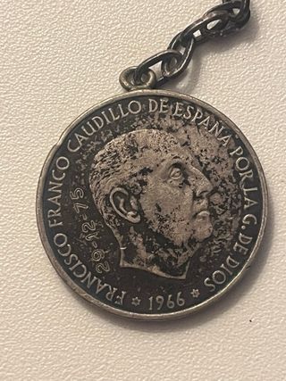 Llavero con medalla conmemorativa de Francisco Franco. Hecho a partir de una moneda de 100 pesetas de 1966. Hecho de plata inclusive la cadena. - Medalla de plata. - Inscripción: Francisco Franco Caudillo de España por la G. de Dios 1966. - Diseño con perfil de Francisco Franco.